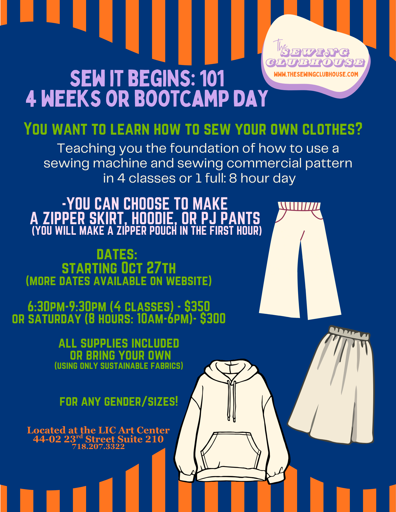 Categories: Select a Category Workshop ADULT CLASSES/WORKSHOPS Workshop | Sewing Machine Basics Beginner Workshop (make an upcycle tote bag out of jeans) (3 HRS) $90.00 Nov 13th Thurs(6:30-9:30pm) Nov 20th Thurs(6:30-9:30pm) Dec 4th Thurs (6:30-9:30pm) Dec 11th (6:30-9:30pm Dec 18th(6:30-9:30pm) ADD TO CART Added! Sew It Begins 101: 4 classes OR 1 full day: Make your own clothes from $300.00 Select DATES Nov 15th Saturday: 10am-6pm Nov 24th-Dec 15th: Mondays 6:15p-9pm ADD TO CART Added! “Stitch & Dopp It”: Toiletry bag/Dobb Kit Workshop Dec 9th Tues: 6:30-9:30p $90.00 ADD TO CART Added! On The Mend 101: Clothing Workshop NOV 19TH: 6:30-9PM $30.00 ADD TO CART Added! “Life’s rough, but at least your hem is even.” Workshop $95.00 DEC 7TH SUNDAY 10-1PM JAN 11TH: SUNDAY 10-1PM ADD TO CART Added! “The Heat Is On": Oven Mitt Workshop (3hrs) $80.00 Nov 16th Sunday: 3pm-6pm Nov 22nd Sat 3pm-6pm ADD TO CART Added! “Sew What’s Cooking?”: Apron Workshop (3hrs) $85.00 Nov 16th Sunday: 10:30am-1:30pm Nov 22 Sat: 10:30am-1:30pm ADD TO CART Added! ““Towel Me More””: Fancy Kitchen Towels Workshop (3hrs) $80.00 Nov 17th Mon: 6:30-9:30pm Nov 23rd Sunday: 11am-2pm ADD TO CART Added! “Beanie There, Done That” Crochet Movie Night (Friday Nov 21st: 7-9:30pm) from $35.00 Select Material Ticket only-no materials I want to purchase materials to take home ADD TO CART Added! “Signed, Sealed & Sleighed” Holiday Card-Making Movie Friday Night (Dec 5th: 7-9:15pm) $35.00 ADD TO CART Added! “Made to Hang”: Patchwork Stocking Workshop (3hrs) $80.00 Dec 7th Sunday: 2pm-5pm Dec 12th Friday: 6:30pm-9:30pm ADD TO CART Added! "Goal Diggers" Board Movie Friday Night: Jan 9th: 7-9:15pm $35.00 ADD TO CART Added! OPEN STUDIO ($10/hour) MON-FRI from 9am-2pm from $10.00 Select Hours 1 hour 2 hours 3 hours 4 hours 5 hours ADD TO CART Added! A Stitch in Gift-Time from $50.00 Select Value $50.00 $75.00 $100.00 $125.00 $150.00 $175.00 $200.00 $225.00 $250.00 $275.00 $300.00 Purchase Added! "Sewlo Lessons"- One on One (Adult) from $82.00 Select Hours 1.5 2 2.5 3 3.5 4 4.5 5 5.5 6 Book Now Added!